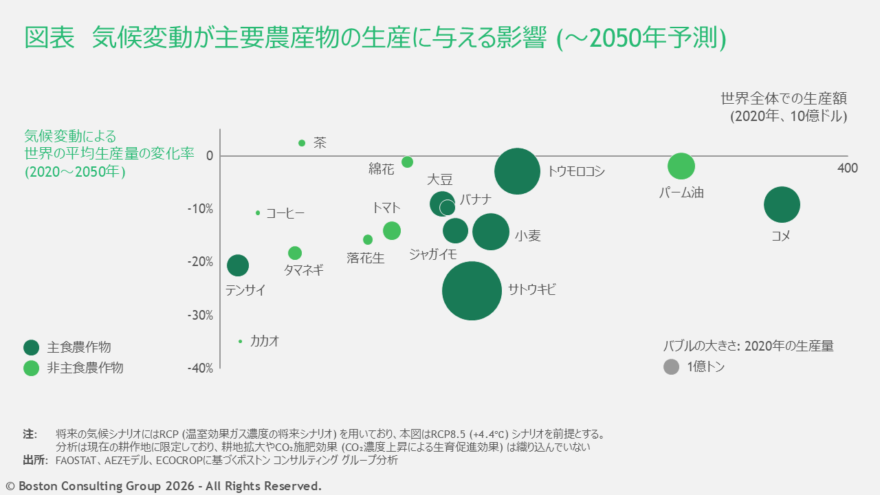 BCGと、その傘下でサステナビリティ領域を担うQuantisは、気候変動の加速が2050年までに与える影響を分析した。対象としたのは、バナナ、カカオ、コーヒー、綿花、落花生、トウモロコシ、タマネギ、パーム油(アブラヤシ由来)、ジャガイモ、コメ、大豆、テンサイ、サトウキビ、茶、トマト、小麦の15の主要農産物だ。これらは世界の農産物生産量の65%、および総カロリー摂取量の70%を占める。