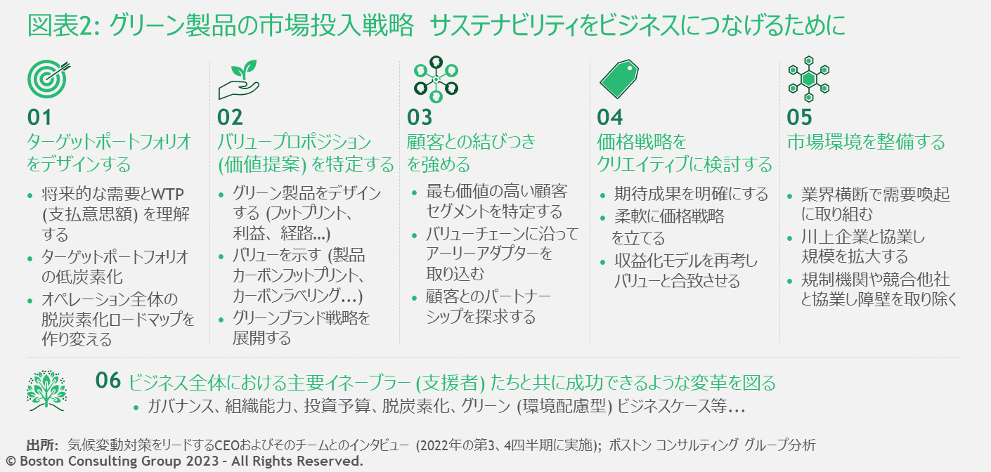 一方、川下企業は消費者に訴求する脱炭素製品の開発に苦戦しています。レポートでは、サステナビリティをビジネスにつなげるために企業が取るべき6つのアクションを解説しています(図表2)。